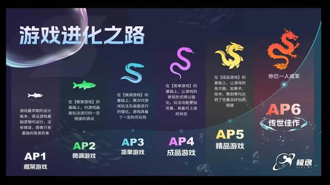 SOON将平台创作的游戏品质划分为AP1至AP6六个等级。首次生成的游戏为AP1级(框架游戏),在此基础之上,你可借助SOON AI不断迭代玩法、拓展深度、打磨视觉表现,推动游戏一路跃升至AP5级(精品游戏),乃至最高等级的AP6级(传世佳作)。