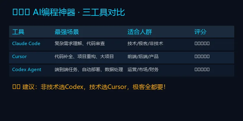 今天给大家推荐三个神器:ClaudeCode、Cursor、ChatGPTCodex。