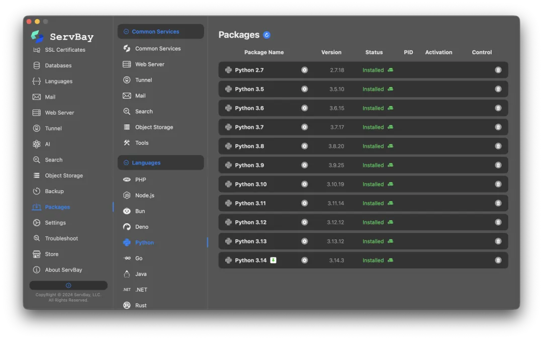 通过 ServBay,开发者可以一键部署 Python 和 Node.js 环境。无论是写爬虫、做数据分析,还是跑前端框架,都不再需要去折腾环境变量。它还自带了常用的数据库管理,省去了单独安装和配置的麻烦。这种开箱即用的体验,为 AI 辅助开发打下了稳固的基础。
