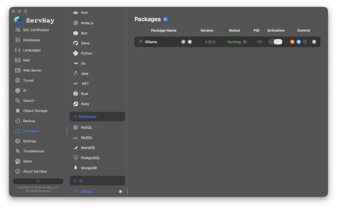 ServBay 的还能支持 Ollama。如果开发者想在本地跑大模型,或者在开发过程中调用本地的 AI 能力,ServBay 可以提供非常丝滑的支持。这种本地化的 AI 服务方案,既能保护代码隐私,又能减少对云端 API 的依赖,非常符合现在的本地化开发趋势。