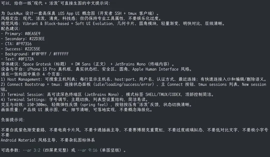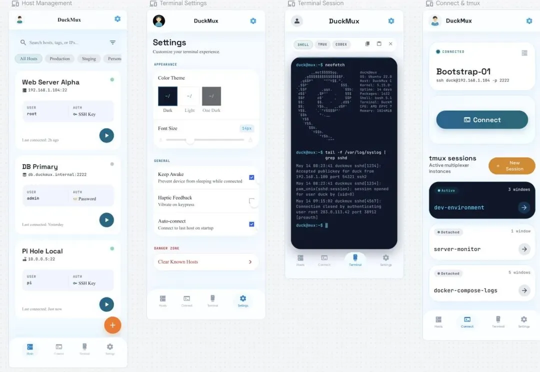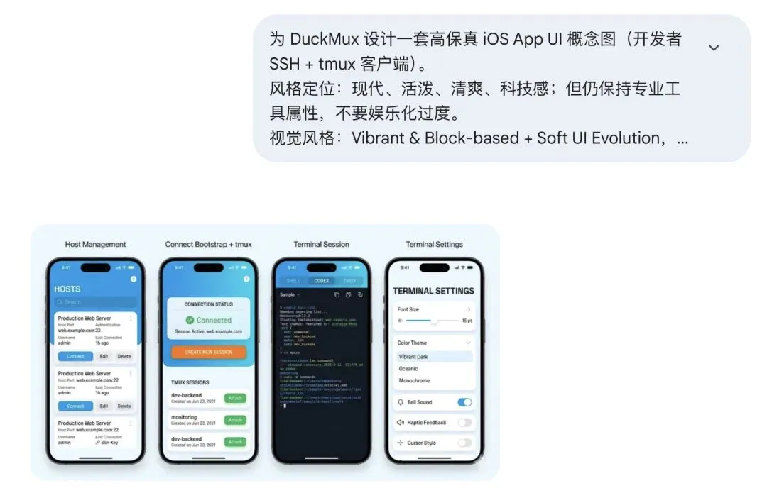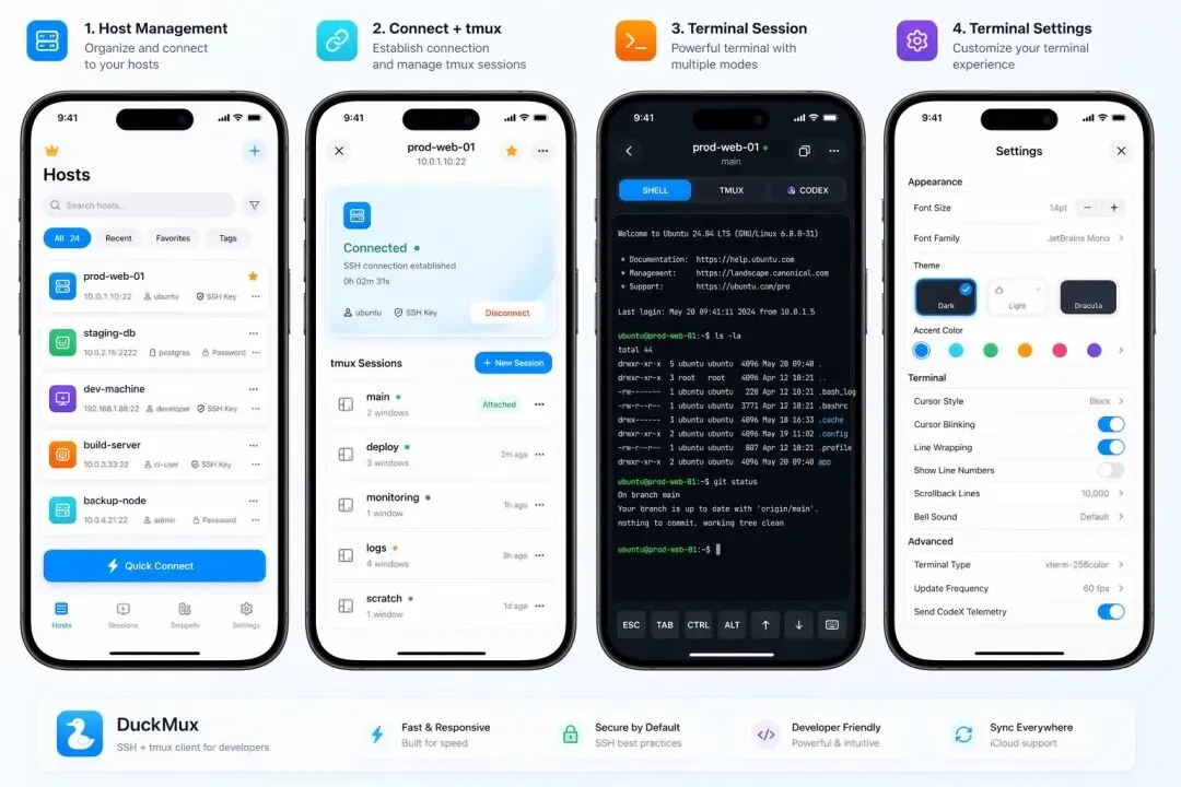为 DuckMux 设计一套高保真 iOS App UI 概念图(开发者 SSH + tmux 客户端)。 风格定位:现代、活泼、清爽、科技感;但仍保持专业工具属性,不要娱乐化过度。 视觉风格:Vibrant & Block-based + Soft UI Evolution,几何卡片、圆角模块、轻量渐变、明快对比、层级清晰。 配色建议: - Primary: #0EA5E9 - Secondary: #22D3EE - CTA: #F97316 - Success: #22C55E - Background: #F0F9FF / #FFFFFF - Text: #0F172A 字体建议:Space Grotesk(标题) + DM Sans(正文) + JetBrains Mono(终端内容)。 设备与平台:iPhone 15 Pro 真机框,真实状态栏、安全区、圆角、Apple Human Interface 风格。 请在一张构图中展示 4 个页面: 1) Host Management:可搜索主机列表;每行显示主机名、host:port、用户名、认证方式、最近连接;有快速连接入口和编辑/删除语义。 2) Connect Bootstrap + tmux:连接状态面板(idle/loading/success/error)、主 Connect 按钮、tmux sessions 列表、New session 按钮。 3) Terminal Session:高可读深色终端区(JetBrains Mono),模式标签 SHELL/TMUX/CODEX,顶部控制简洁。 4) Terminal Settings:字号调节、主题切换、列表型设置结构,简洁易读。 交互与动效:150-300ms,轻微弹性反馈(spring feel),按钮按压有“活泼”反馈,状态切换清晰。 画面质量:产品级 UI 展示图,4K,细节清晰,可落地实现,不要概念海报化。