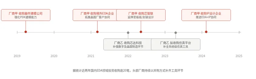 一是并购密集提速。据统计,近两年国内至少已有20笔投资和收购交易涉及EDA公司。头部厂商的逻辑很清晰:对标海外三巨头当年的路径,通过持续并购把缺失的工具环节补齐,最终拼出一套完整的全流程工具链。这条路有其合理性,海外三巨头自成立以来已合计完成超230次并购,工具链的完整性本身就是长期积累的结果。