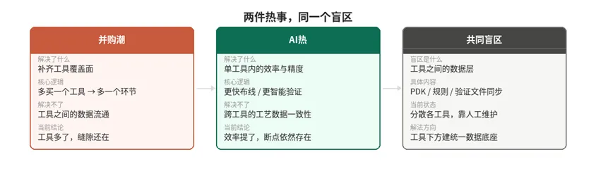 这层差距不在并购的议程里,也不在AI的优化范围内。它需要的不是更多工具,而是在工具之下建立一套以PDK为核心的统一数据模型,让规则变更能够自动传导,让各个工具从同一个数据源取数,而不是各自维护各自的一份。