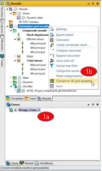 第一步,在Petrel的Cases窗口,点中VISAGE有限元计算的地质力学工况Visage_Case_1,在Results栏中,右键点击Simulation grid results,选择Convert to 3D property,弹出Settings for ‘Simulation grid results’的模拟结果转换窗口。