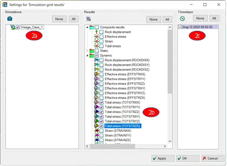第二步, 在模拟结果转换窗口,按顺序在Simulations中勾选工况,在Results中勾选动态属性下的六个总应力分量,在Timesteps中勾选时间,点击OK, 将Results中的六个主应力分量转换成Models下的三维属性体。