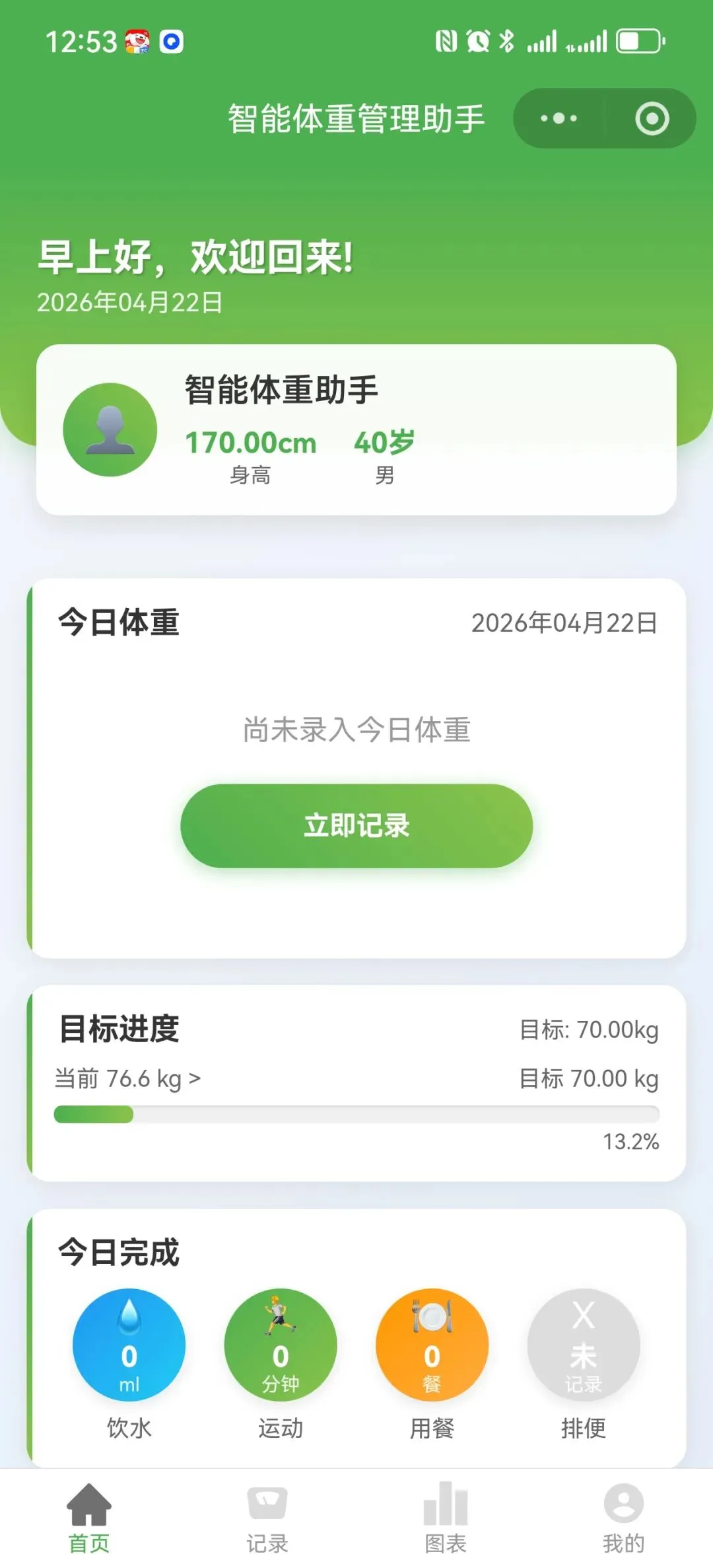 一个智能化的体重管理和健康助手微信小程序,可以记录体重、自动计算BMI和体脂率,智能跟踪饮食、饮水、运动和排便情况,并提供专业的数据分析和可视化报告。