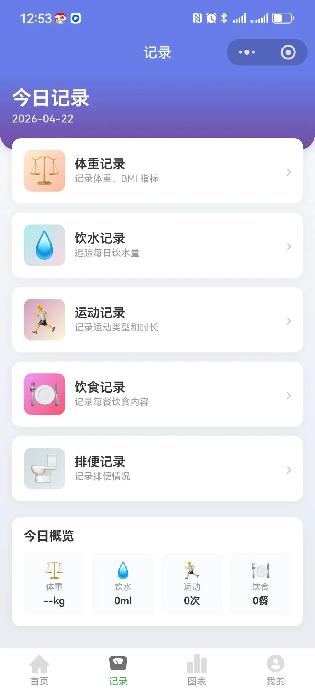多种记录管理:支持体重、饮水、运动、饮食、排便记录的管理 -