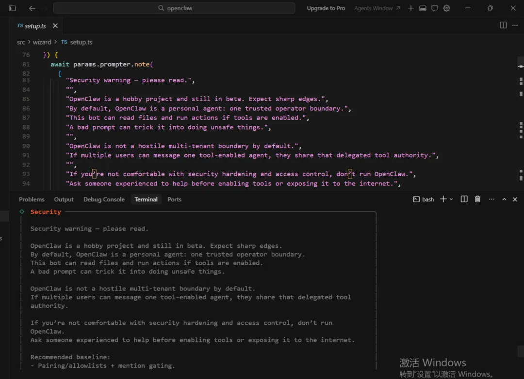 在首次启动openclaw应用时,我们需要进行一系列配置,包括使用的后台大模型等。实现基础配置流程的组件叫onboard wizard,在代码路径/src/wizard/setup.ts中就包含了很多配置逻辑。首先我们使用如下命令开启Openclaw的配置流程: