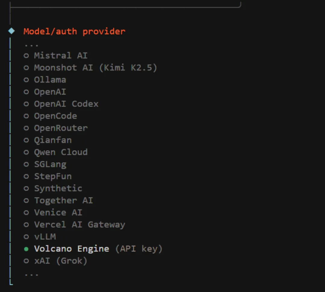 回到控制台上的配置流程。我们同意security warning后,在接下来的配置中大多数我们都默认即可。openclaw作为一个本地agent,可以认为他就是操作系统上的应用程序,而对应的大模型等价于操作系统,openclaw的功能依赖于后台大模型的驱动,因此在配置时必不可免的设置后台大模型,目前Openclaw支持市面上几乎所有大模型: