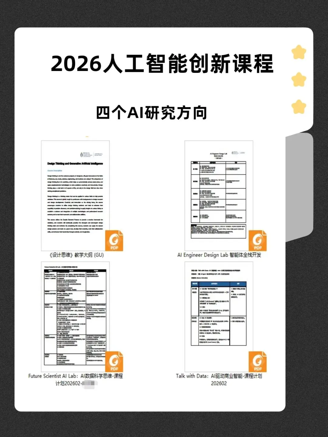 课程围绕四大方向展开,构建完整AI能力体系,覆盖技术、数据、商业与创新多个维度。不同兴趣背景的学生,都能在其中找到适合自己的路径。