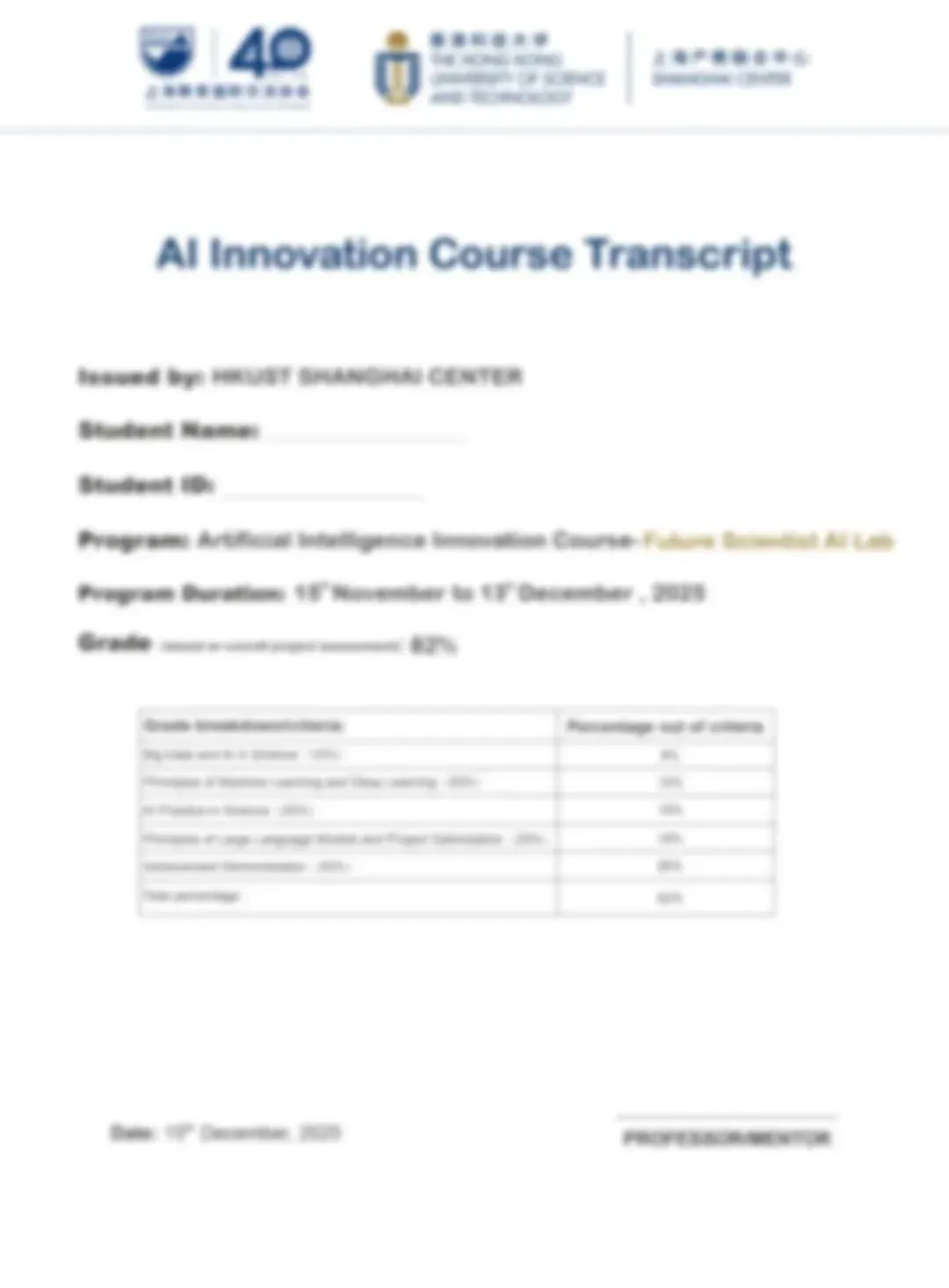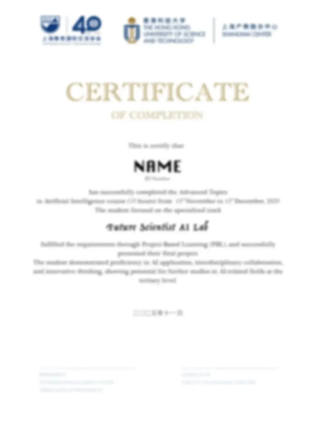 完成课程后,学生将获得由港科大上海中心与课程研发中心联合颁发的证书及成绩单,可作为升学材料的重要补充。
