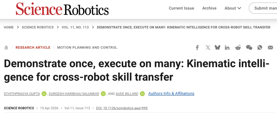 换手机能同步App,换机器人就得重头教技能?Science子刊发表的“运动学智能”破解了这道难题