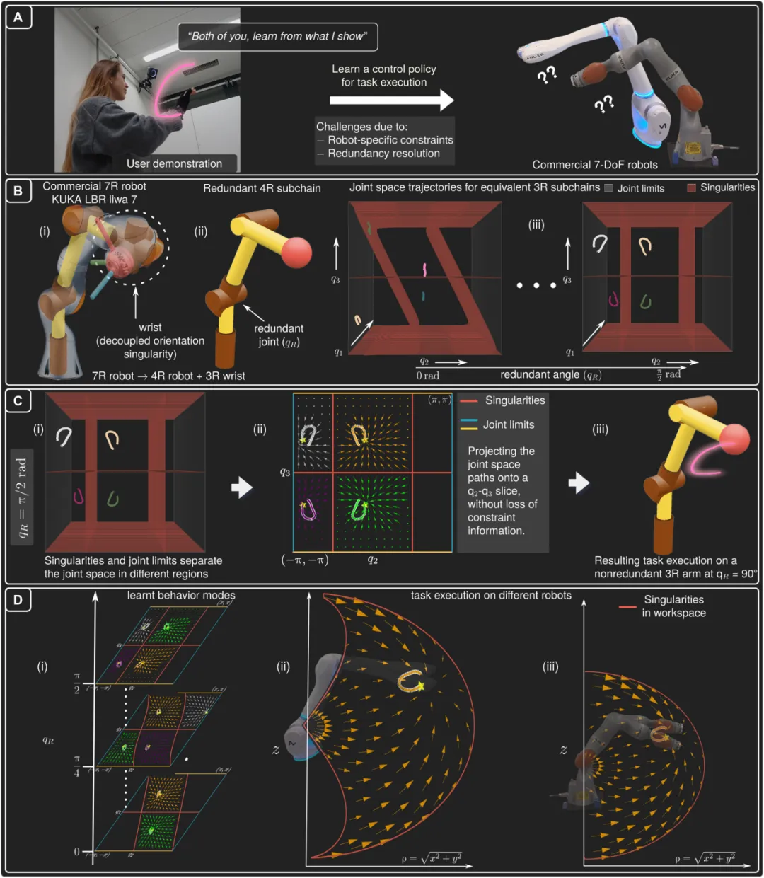 这项研究的思路截然不同。它认为,既然奇异点和关节限位是由机器人设计参数完全确定的解析数学问题,就应该将它们作为“第一性原理”,在控制策略成型之前就编码进去。