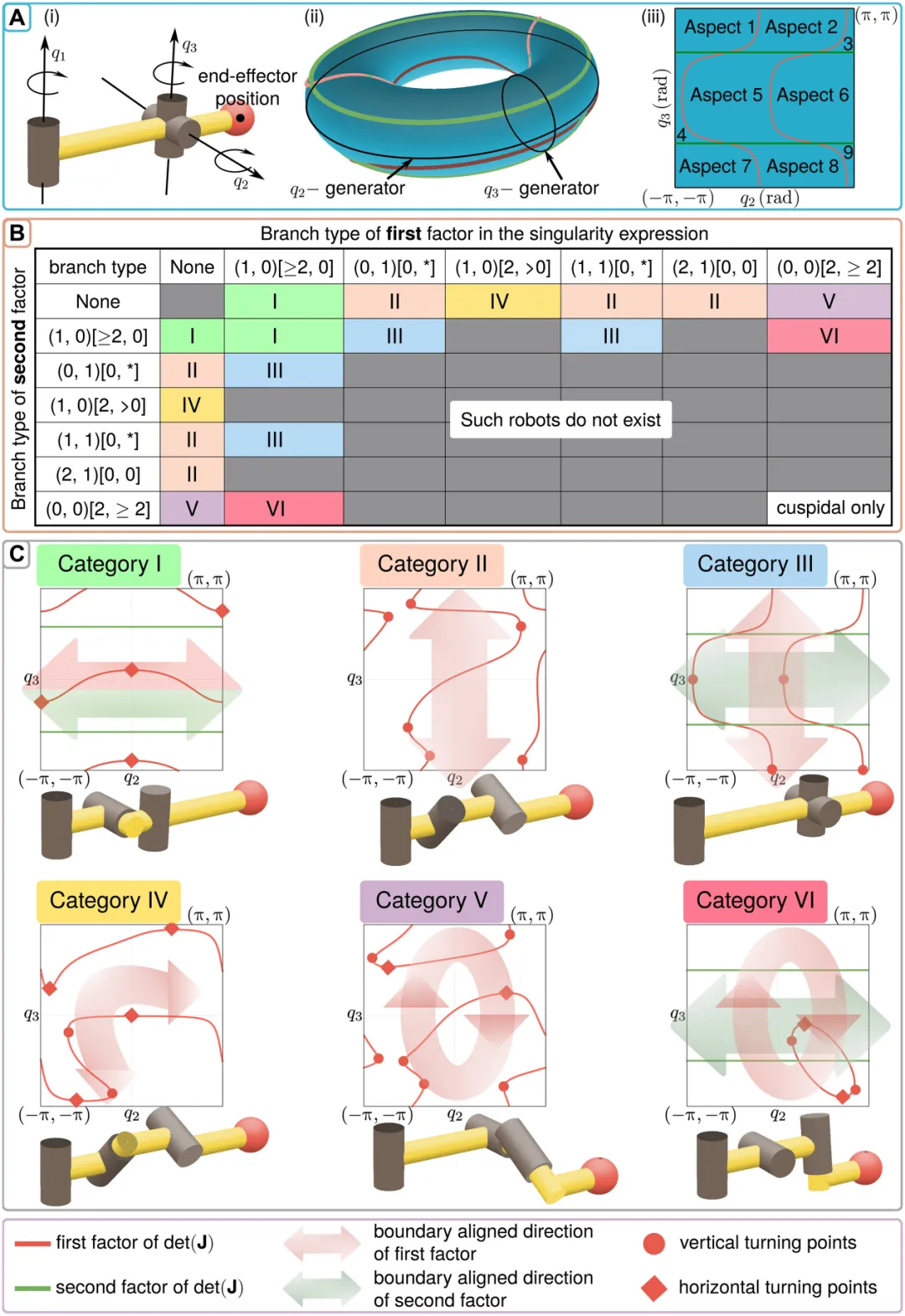 简单来说,他们通过分析关节空间里的奇异点几何形态,将所有3R机器人分成了六个典型类别(I至VI类)。有的类别奇异点像个闭环,有的像交叉线,有的像平行线。这就像是给机器人做了个基因测序,明确了它的体质特征。