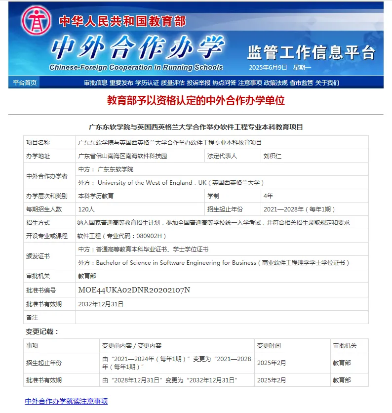 广东东软学院与英国西英格兰大学合作举办软件工程专业本科教育项目于2020年获得教育部审批通过,相关批准信息在中外合作办学监管工作信息平台上可查,项目招生纳入普通高等学校招生计划,项目颁发毕业证书和学位证书均受教育部认可。