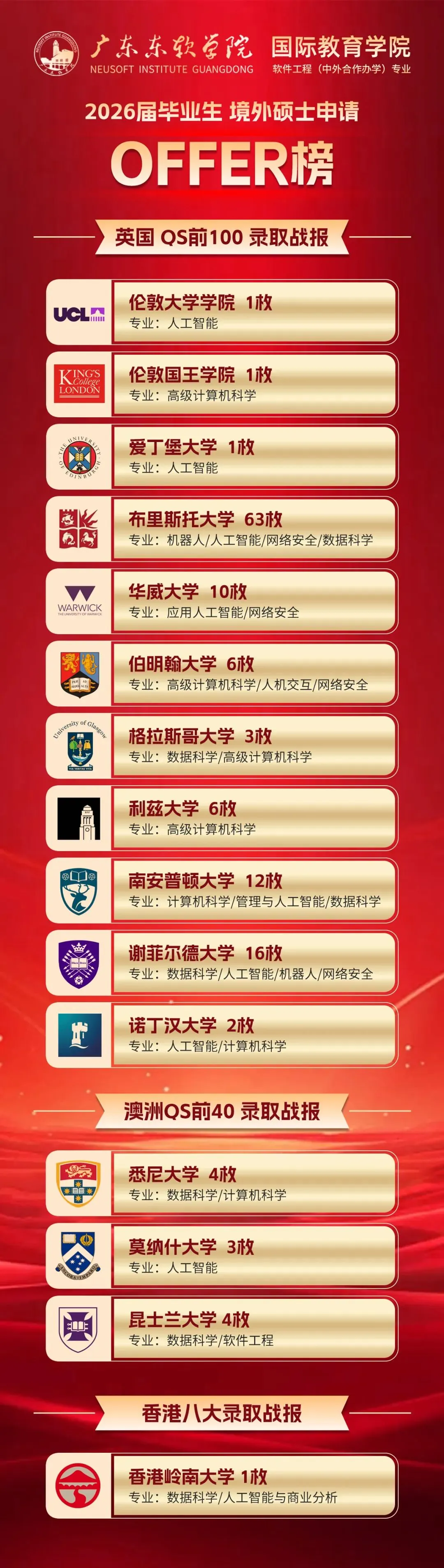 人才培养硕果盈枝,2025升学就业绽荣光。2025届毕业生72人,毕业率100%。海外升学率为40%,多名学子从东软出发,走向伦敦大学学院、布里斯托大学、悉尼大学等世界名校,升硕成绩居广东省民办高校前列;2名优秀毕业生分别被黄埔海关和中山税局录取。