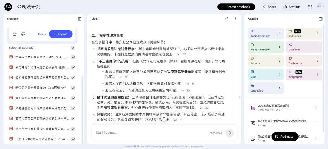 这一点无论重复多少遍都不为过。NotebookLM可以帮你快速找到材料中的关键信息、发现数据矛盾、生成结构化摘要,但它不做法律判断。最终的分析、取舍和结论,必须由你来完成。