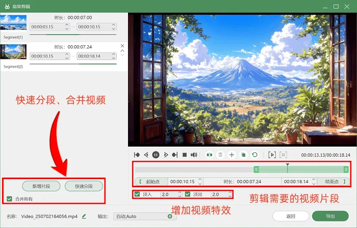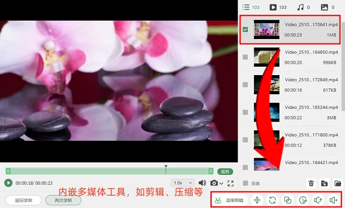 步骤3:录屏完成后,无需使用其他软件,直接利用数据蛙录屏软件内置的高级剪辑功能,即可对视频进行编辑处理,包括快速分段、删除多余片段、添加特效以及调整画面等操作,一站式满足视频编辑需求。
