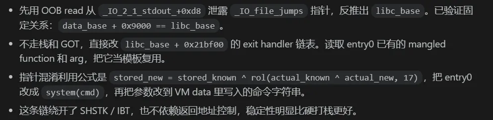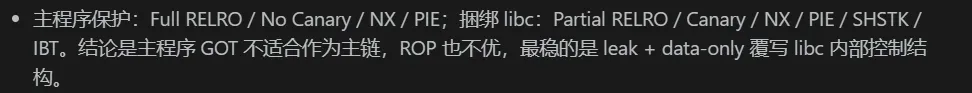 这道题给我最大的感受是,全保护环境下,硬刚栈 ROP 往往是死路,而 libc 内部的控制结构才是真正的突破口。AI 在整个过程中帮我做了几件关键的事: