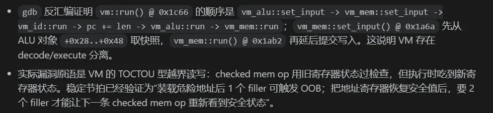 精准识别 VM 的 decode/execute 分离,点破 TOCTOU 漏洞的本质。 -