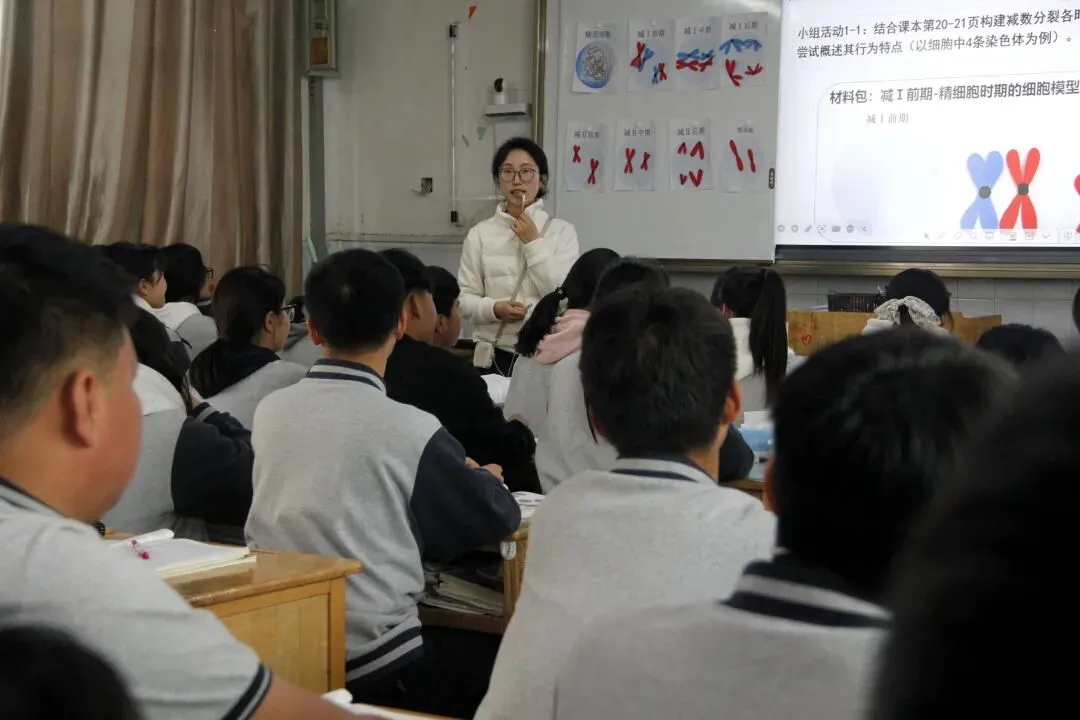 蒋慧老师以“一只海豚AI”趣味素材切入减数分裂课题,瞬间激活课堂氛围。教学采用探究式活动,学生利用材料包自主构建减数分裂模型,将抽象概念具象化。课堂任务由浅入深,围绕“精子的形成方式”“染色体行为”等重难点突破,AI模型贯穿始终,实现了“做中学、思中学”。本节课将AI技术与课堂教学深度融合,设计新颖,有效提升课堂效率。