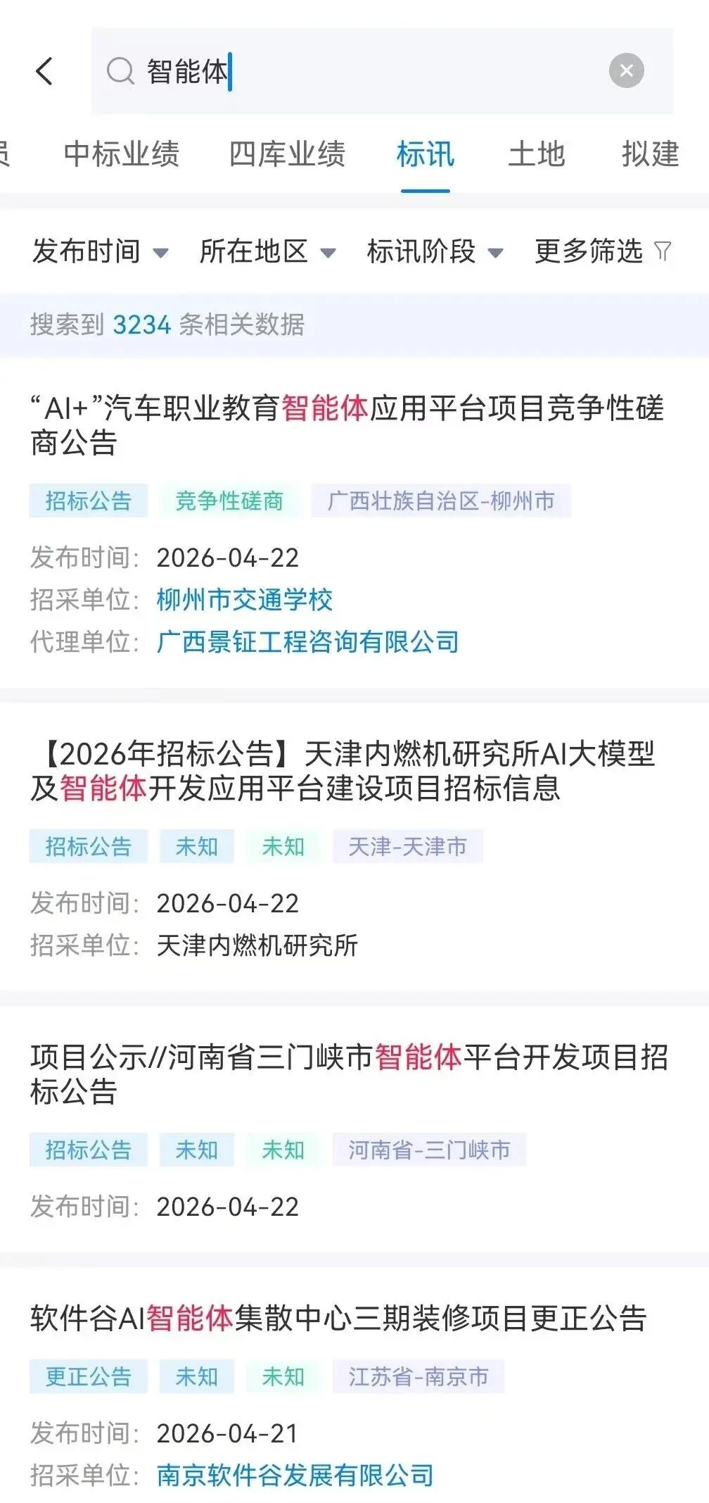 2、多维筛选精准过滤,商机匹配更高效支持发布时间、所在地区、标讯阶段、采购单位多维度条件筛选,你可以按需锁定所属省份、项目类型、采购主体,快速剔除无关信息,精准筛选适配自身业务的智能体招标项目,不用在海量信息里大海捞针。