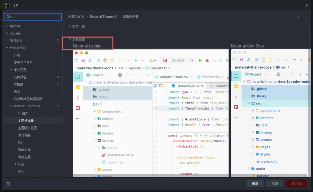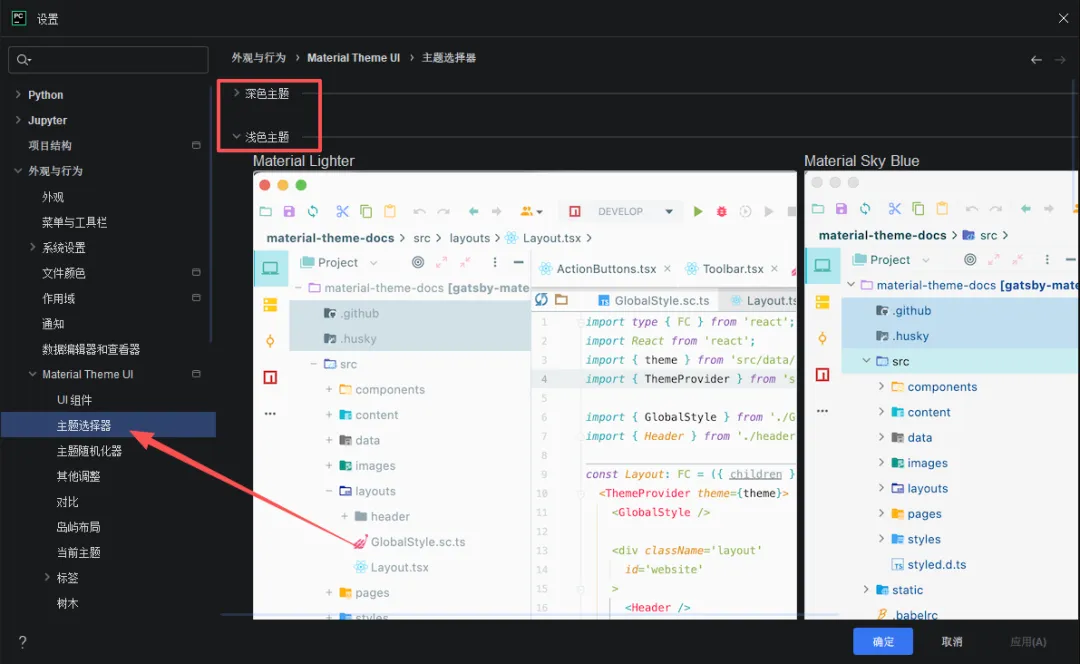 在这个设置里面,找到这个UI主题插件,打开它下面的目录,找到主题选择器,在这里有深色主题也有浅色主题