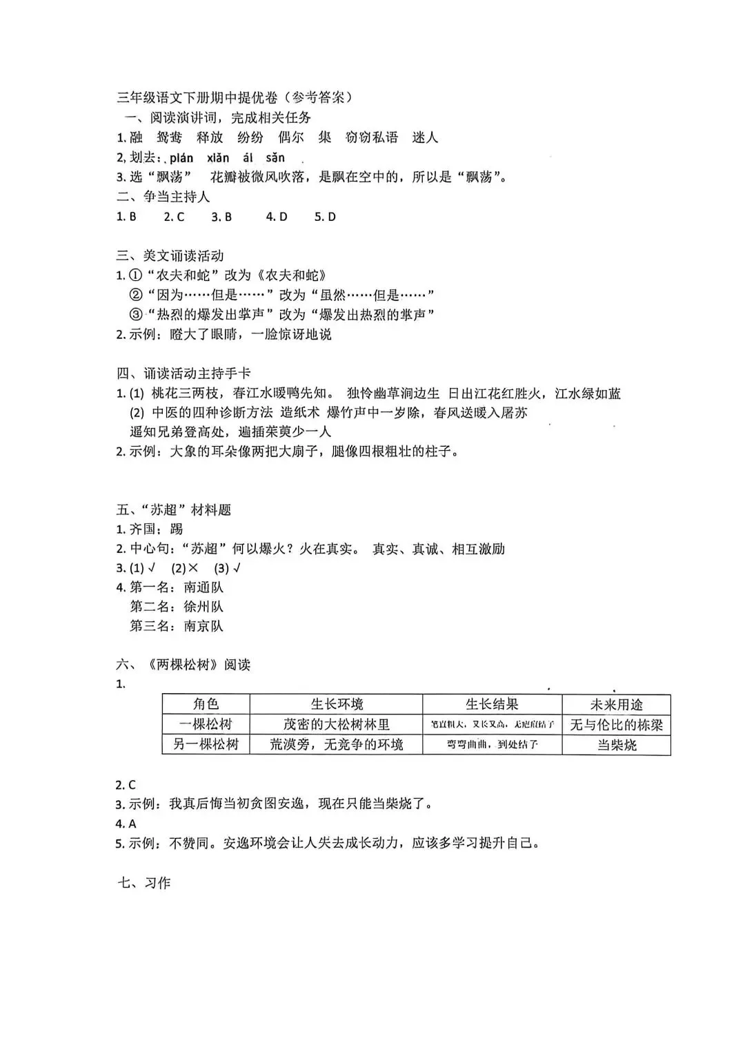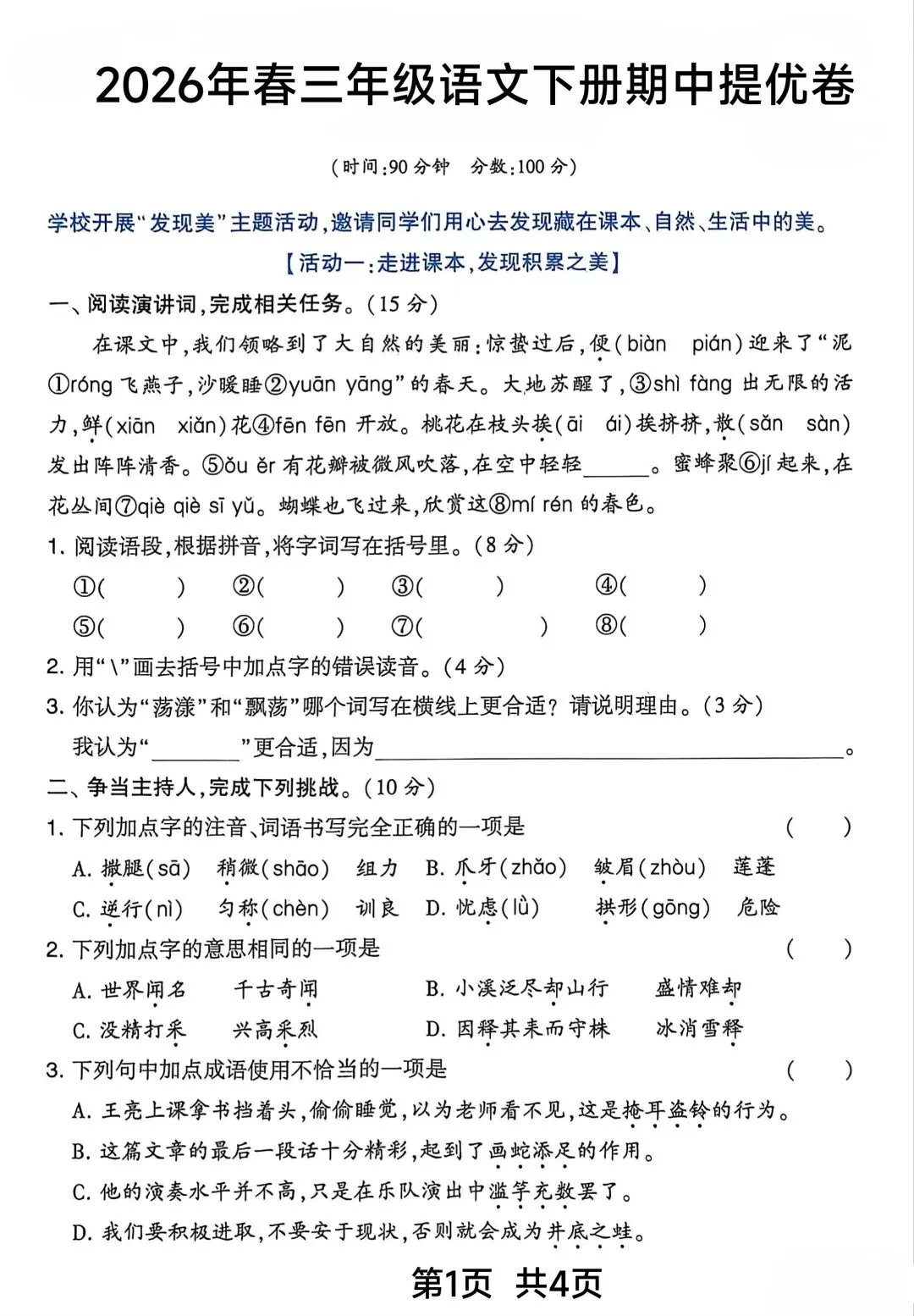 三年级语文下册期中提优卷可直接打印 · 附完整答案