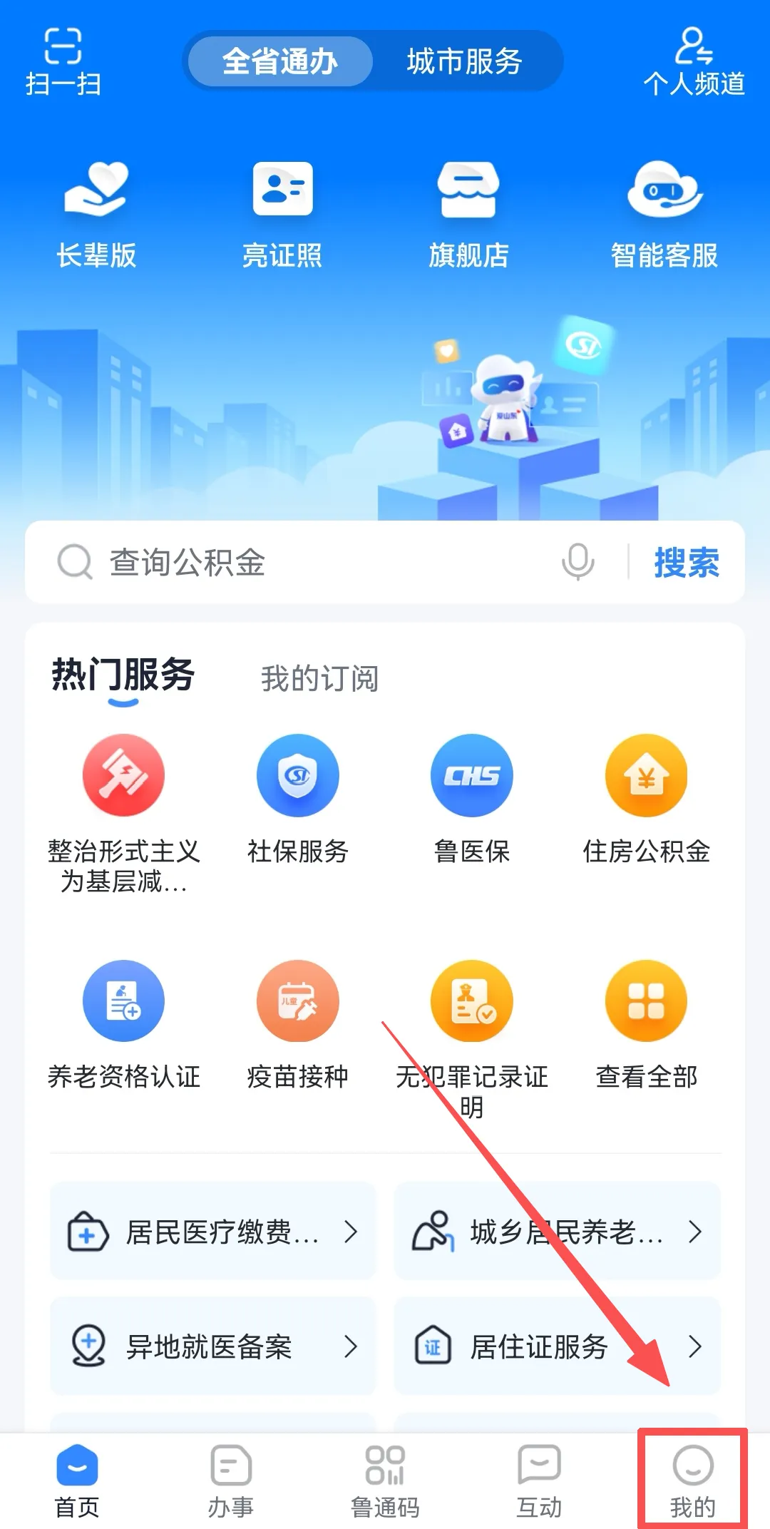 1、下载“爱山东”APP,打开首页,点击右下角“我的”按钮。