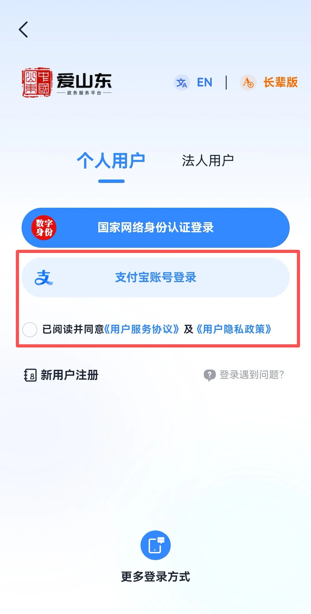 2、登录页面选择“个人用户”,选择“支付宝账号登录”,或输入手机号码和验证码,登录“爱山东”APP。