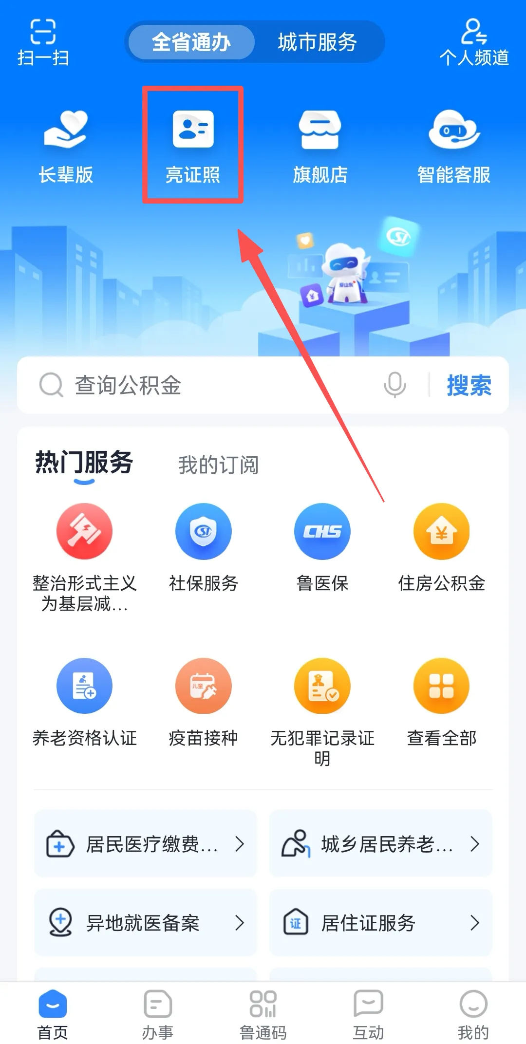 3、登录成功后,首页选择“亮证照”,进入“人脸识别认证”。