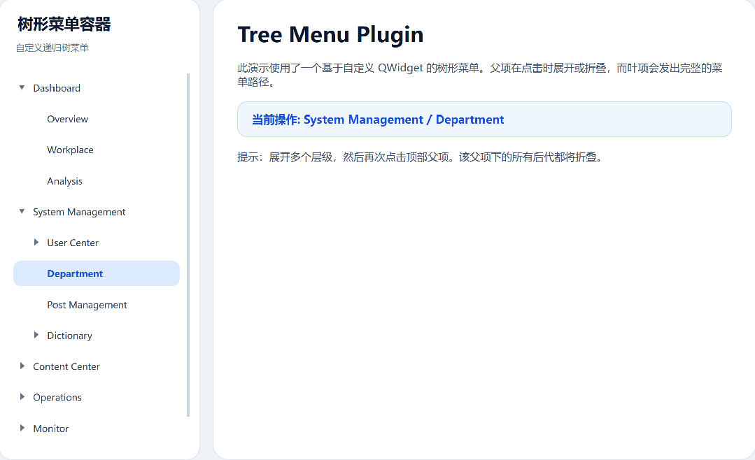 本文实现的插件叫 MenuPluginTreeWidget,它是一个独立的树形菜单组件。外部只需要传入多维菜单数据,插件内部递归解析数据,并按展开状态动态生成可见菜单项。父节点点击时展开或收起,叶子节点点击时发出完整路径回调。