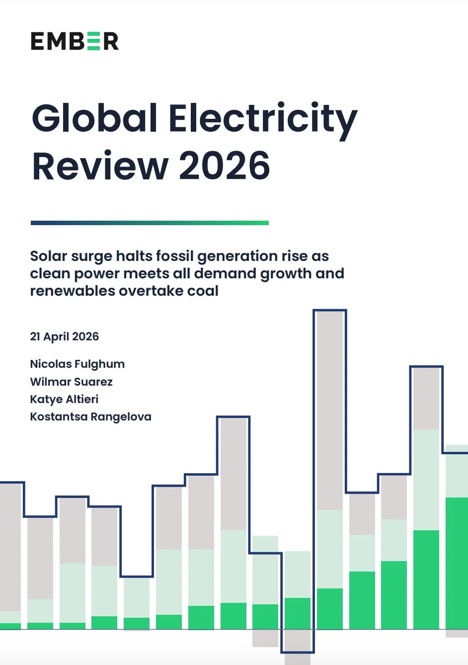 4月21日,EMBER发布《2026年全球电力评论》表示,太阳能强劲增长抑制了化石能源扩张,清洁电力包揽全部新增需求,可再生能源发电量首超煤电。