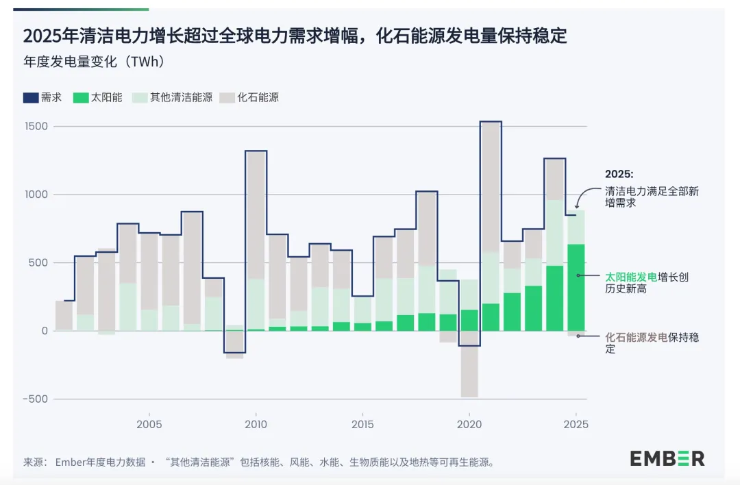 2025年,太阳能发电实现历史性突破,其增量足以覆盖所有新增电力需求,成功遏制了化石能源发电量的持续攀升。这是自2020年以来首次出现化石能源发电量零增长,也是本世纪仅第五次未出现上升。