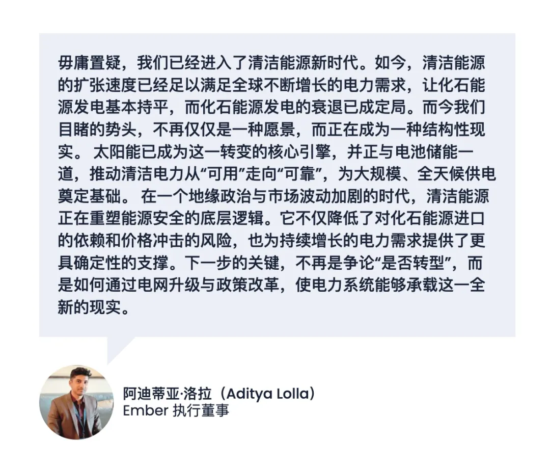 全球电力行业正告别化石燃料增长时代,迎来清洁电力主导的新纪元。充足的清洁电力正在推动交通等其他领域加快电气化进程,进而在更广泛的经济体系中抑制化石燃料需求的增长。