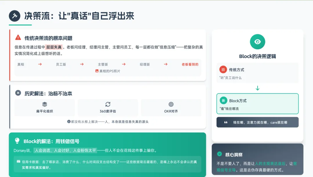 所以Block的决策层做的,其实不是在“听”员工说什么,而是在“看”钱往哪流。钱在哪,注意力就在哪,care就在哪。这是去伪存真最硬的方式。