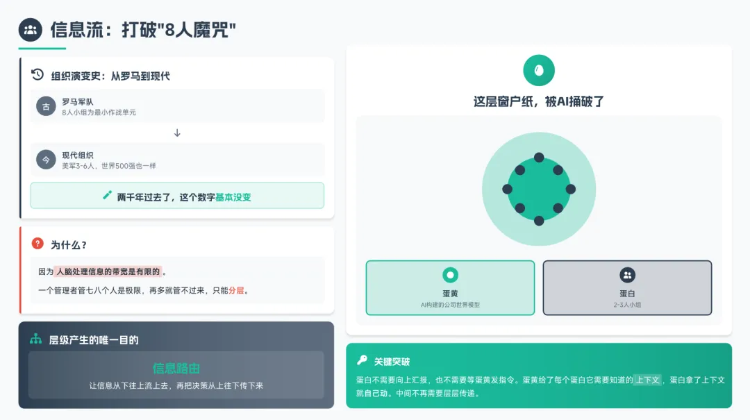 蛋黄:AI构建的“公司世界模型”。实时知道什么在发生,什么被卡住了,资源分配在哪里,什么在运转什么在失效。这个模型,原来是由层层管理者用自己的大脑构建和传递的。