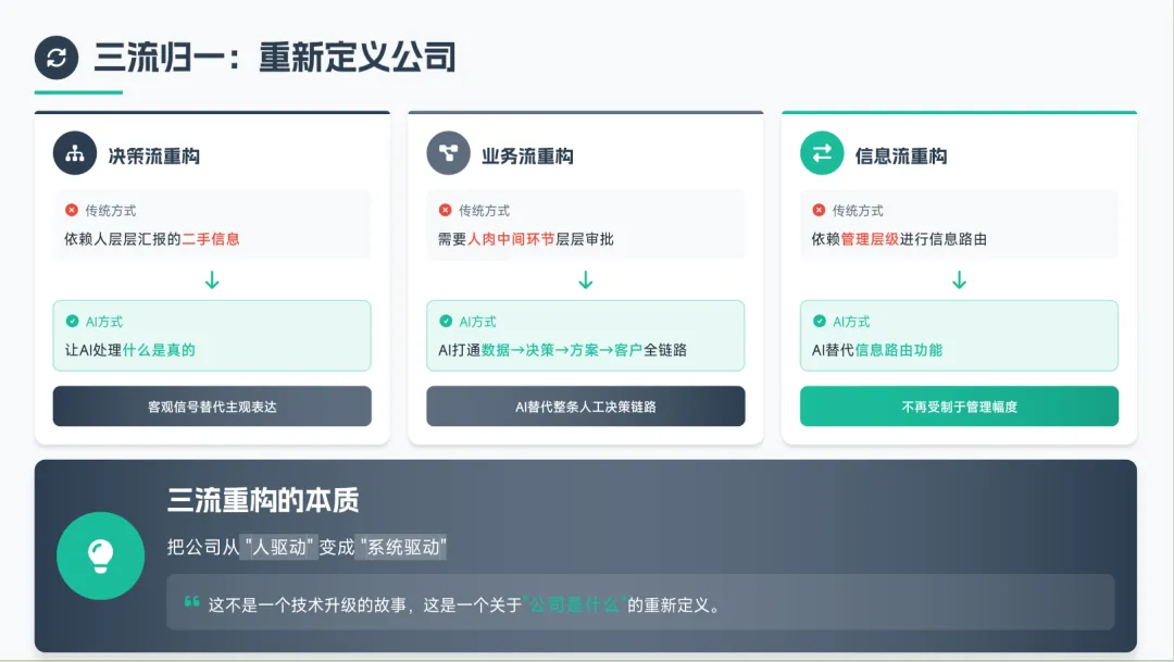 一家企业本质上只有三条流在跑:决策流、业务流、信息流。 过去两千年,所有组织变革折腾的,都是这三条流怎么更高效地流转。而AI,第一次让这三条流同时被重构成为可能。