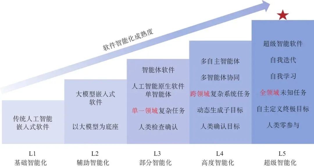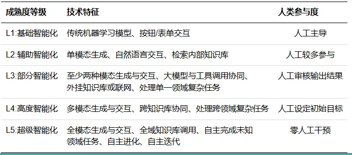 各级别间均存在显著关键差异。L1~L2,实现了从“规则驱动”向自然语言交互的转型;L2~L3,由智能辅助过渡至智能体,实现单一领域内的智能化升级;L3~L4,突破单一领域限制,通过多智能体协同解决系统级问题;L4~L5,具备自我迭代与跨领域自学习能力,进而迈向通用人工智能。