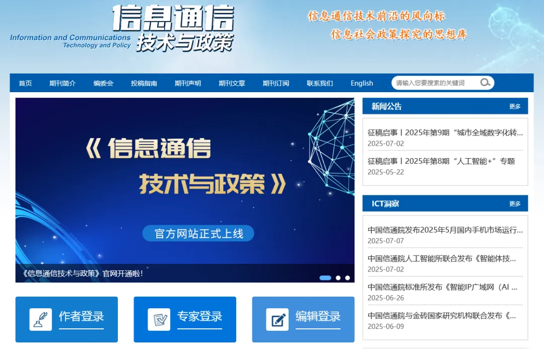 《信息通信技术与政策》是工业和信息化部主管、中国信息通信研究院主办的专业学术期刊。本刊定位于“ 信息通信技术前沿的风向标,信息社会政策探究的思想库 ”,聚焦信息通信领域技术趋势、公共政策、 国家/产业/企业战略,发布前沿研究成果、焦点问题分析、热点政策解读等,推动5G、工业互联网、数字经济、人工智能、大数据、云计算等技术产业的创新与发展,引导国家技术战略选择与产业政策制定,搭建产、学、研、用的高端学术交流平台。