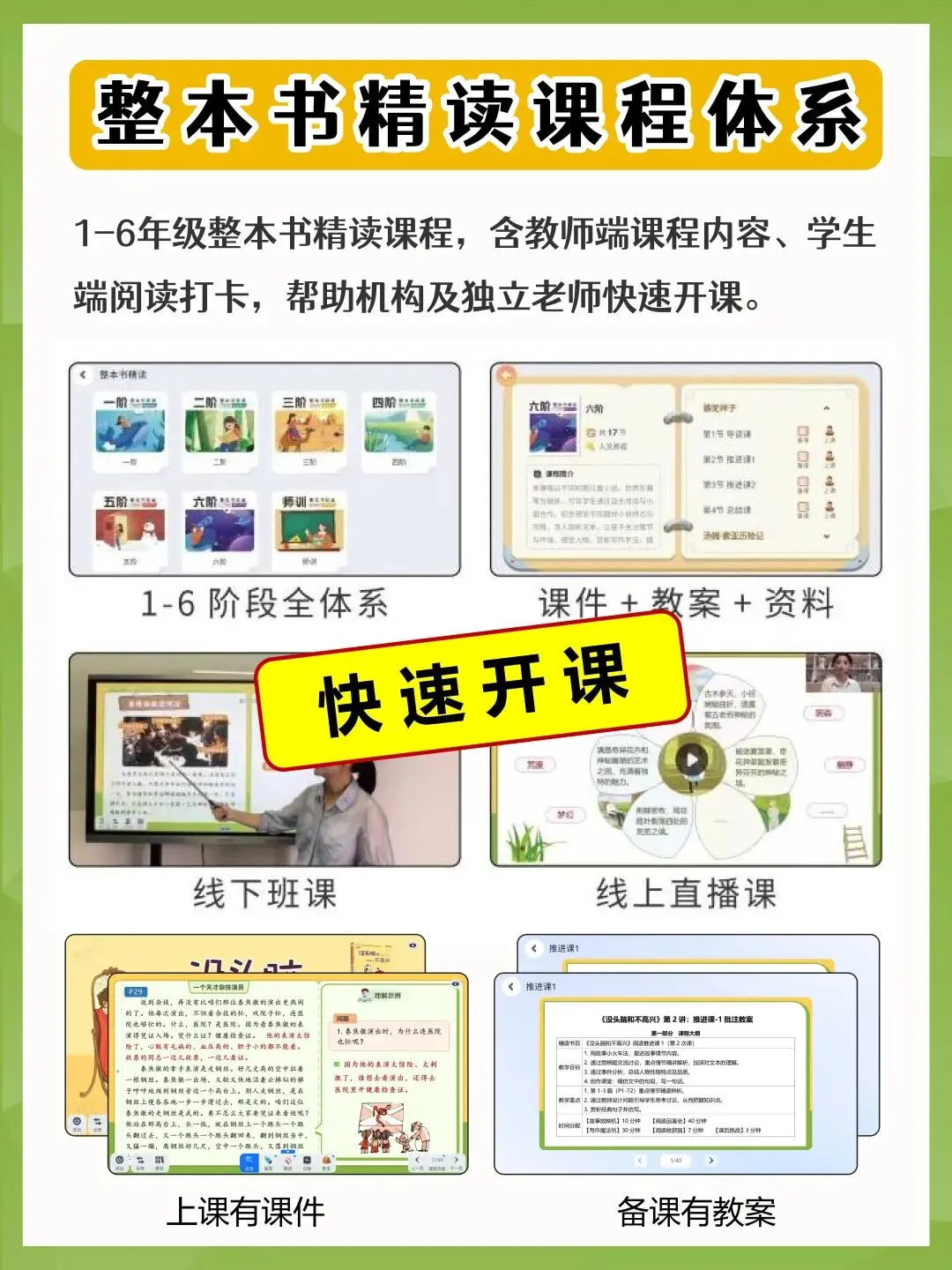 体系完备(精读课堂+阅读任务+阅读测评),覆盖线下班课、线上直播。提供课件+教案+资料,备课无忧!从阅读规划、文本理解到思辨表达、仿写创作,全方位提升学生“能赏析、善思辨、会表达、懂创作”的能力。