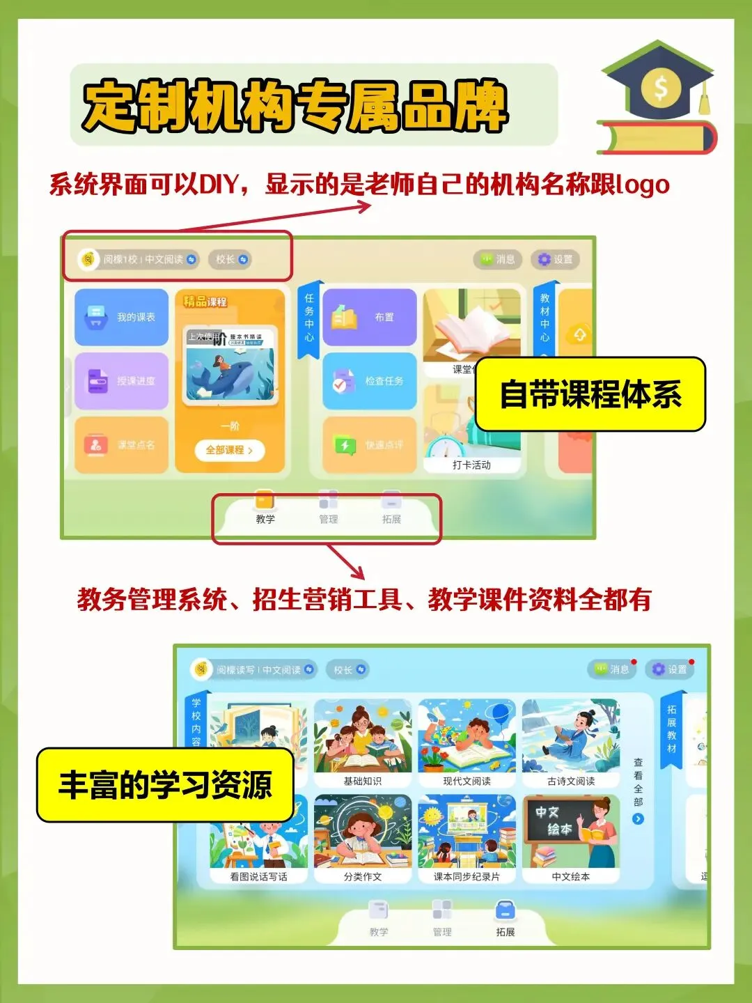 我们的定制APP,有英语、美术、书法、中文阅读(大语文整本书精读课程体系)、口才、音乐、数学等,方便机构开设独具特色的课程,一键拓科。