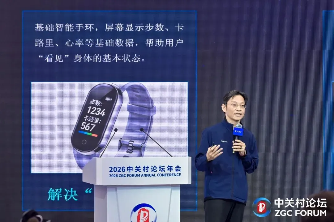 刘博士围绕AI与智能穿戴技术的深度融合进一步阐述,重点强调了从日常基础健康管理到专业虚拟AI教练的全场景服务落地,其对应的核心智能硬件载体正是“无屏手环”和“运动豆”。