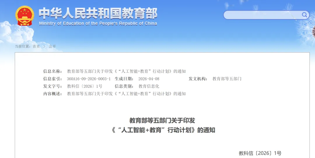 近日,教育部等五部门关于印发《“人工智能+教育”行动计划》的通知,为下一步部署做出了细致规划。从小学到高中、从老师到家长,全链条都要“变天”。今天我们就来看看,到底有什么改变和影响。