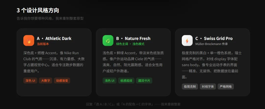 它会先给你 3 个差异化风格方向让你选——不是直接出图,是先帮你想清楚方向: