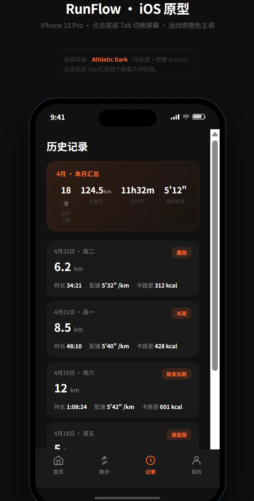 - 4 个核心屏幕:首页、实时跑步、历史记录、个人中心