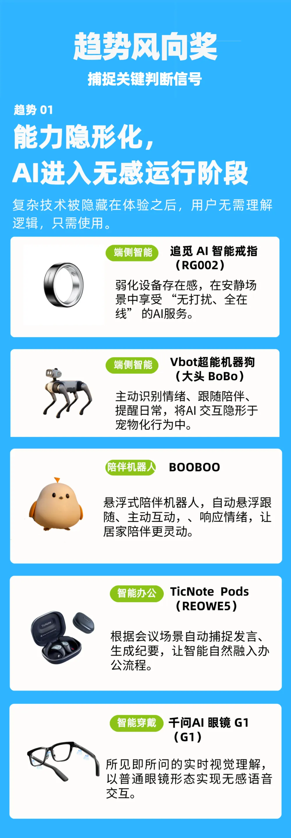 以下5款产品将AI能力“藏”进日常佩戴与自然交互中,不打扰、但始终在线,荣获【能力隐形化】趋势风向奖。
