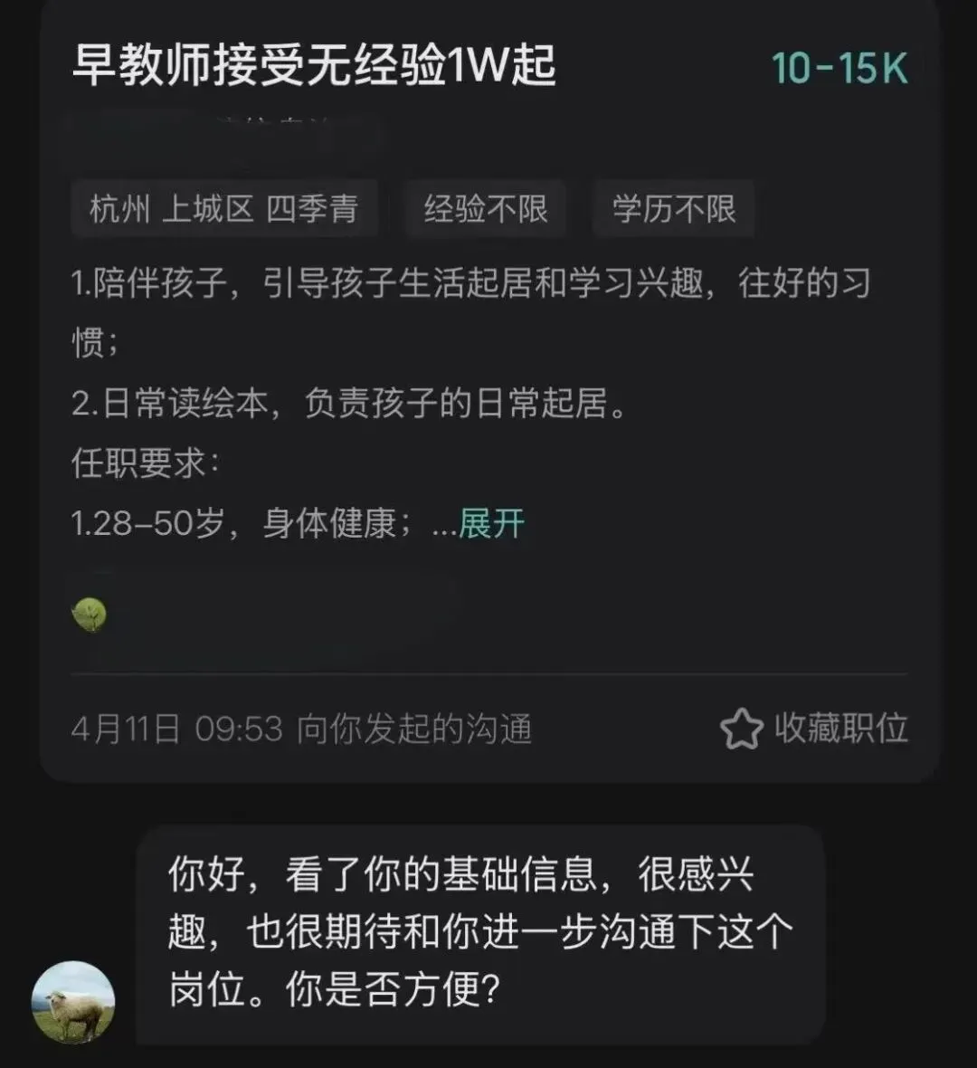 最先找上门的,是xxx信息咨询的“教师”岗位,薪资标着10-15K,写着“接受无经验,1W起”,学历经验全不限,年龄放宽到50岁,看着简直是为我量身定做。HR主动发来消息,热情邀请我沟通,可点开详情页,所谓的“早教师”工作内容,就是陪孩子读绘本、打理起居,本质是住家保姆的活。更讽刺的是,这家公司的招聘账号早已被平台冻结,我惊出一身冷汗——这根本不是招聘,分明是披着高薪外衣的陷阱。