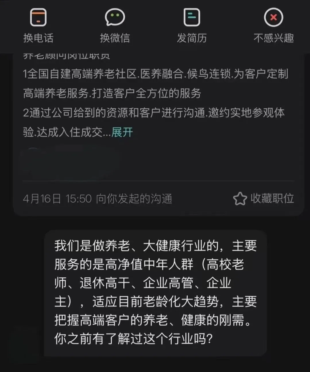 躲过第一个坑,第二个坑来得更快。杭州xx享养老服务的HR陈小姐,发来“养老顾问”的邀约,办公地点在市中心CBD高档写字楼,看着格外正规。她热情介绍,公司主打全国高端养老社区,服务高净值客户,工作就是邀约客户参观体验、促成入住成交。我越听越不对劲:这不就是卖养老理财产品的销售岗?打着“医养融合”的旗号,实则推销动辄几十万的养老床位,无底薪、全靠提成,所谓的“高薪”全是画出来的大饼。