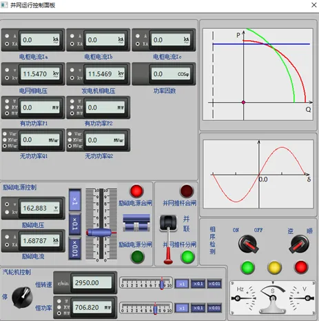 b) 提供同步发电机并网实验面板,可通过面板控制/观察电路中发电机、汽轮机、励磁电源等元件的实时数据